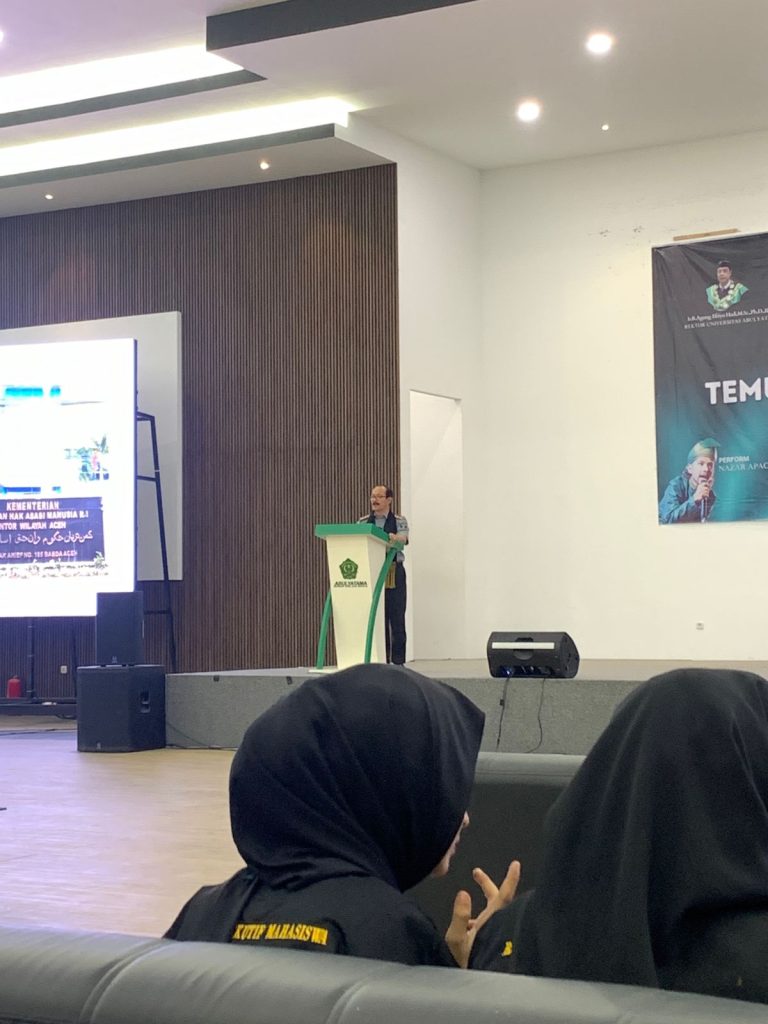 Kepala Kantor Wilayah Kementerian Hukum (Kemenkum) Aceh, Meurah Budiman didapuk menjadi narasumber pada temu Daerah BEM Nusantara Aceh ke-IV yang diselenggarakan di Universitas Abulyatama Aceh, Senin (10/2/2025).