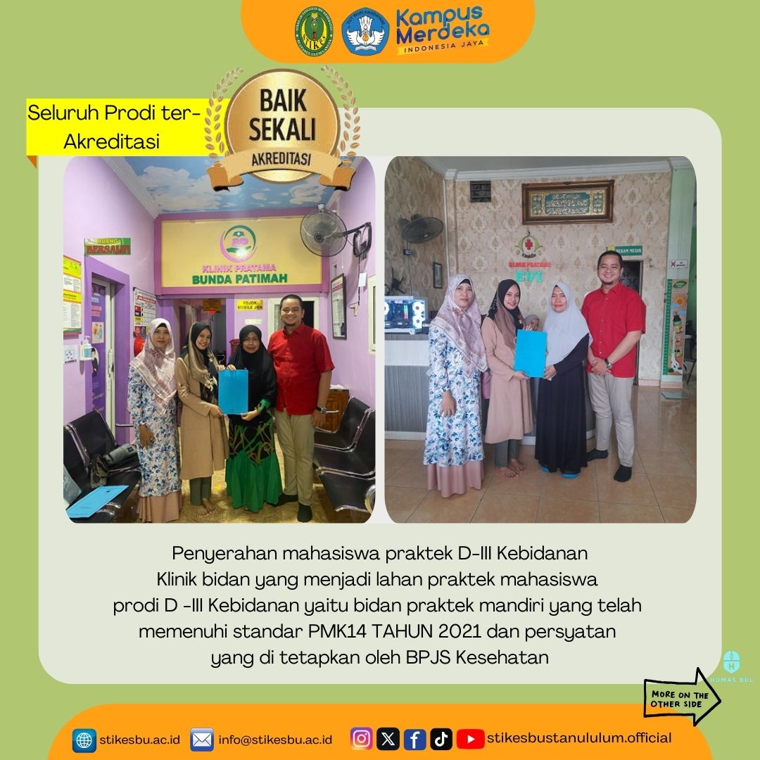 Penyerahan mahasiswa praktek klinik kebidanan II prodi D-III Kebidanan. Klinik bidan yang menjadi lahan praktek mahasiswa prodi D -III Kebidanan yaitu bidan praktek mandiri yang telah memenuhi standarPMK14 TAHUN 2021 dan persyatan yg d tetapkan oleh BPJS Kesehatan. Bidan praktek mandiri yang menjadi lahan praktek mahasiswa prodi D-III berlokasi di Medan Marelan berjumlah 3 klinik yaitu Klinik Bunda Patimah, Klinik Eviyanti dan Klinik Siti Kholijah