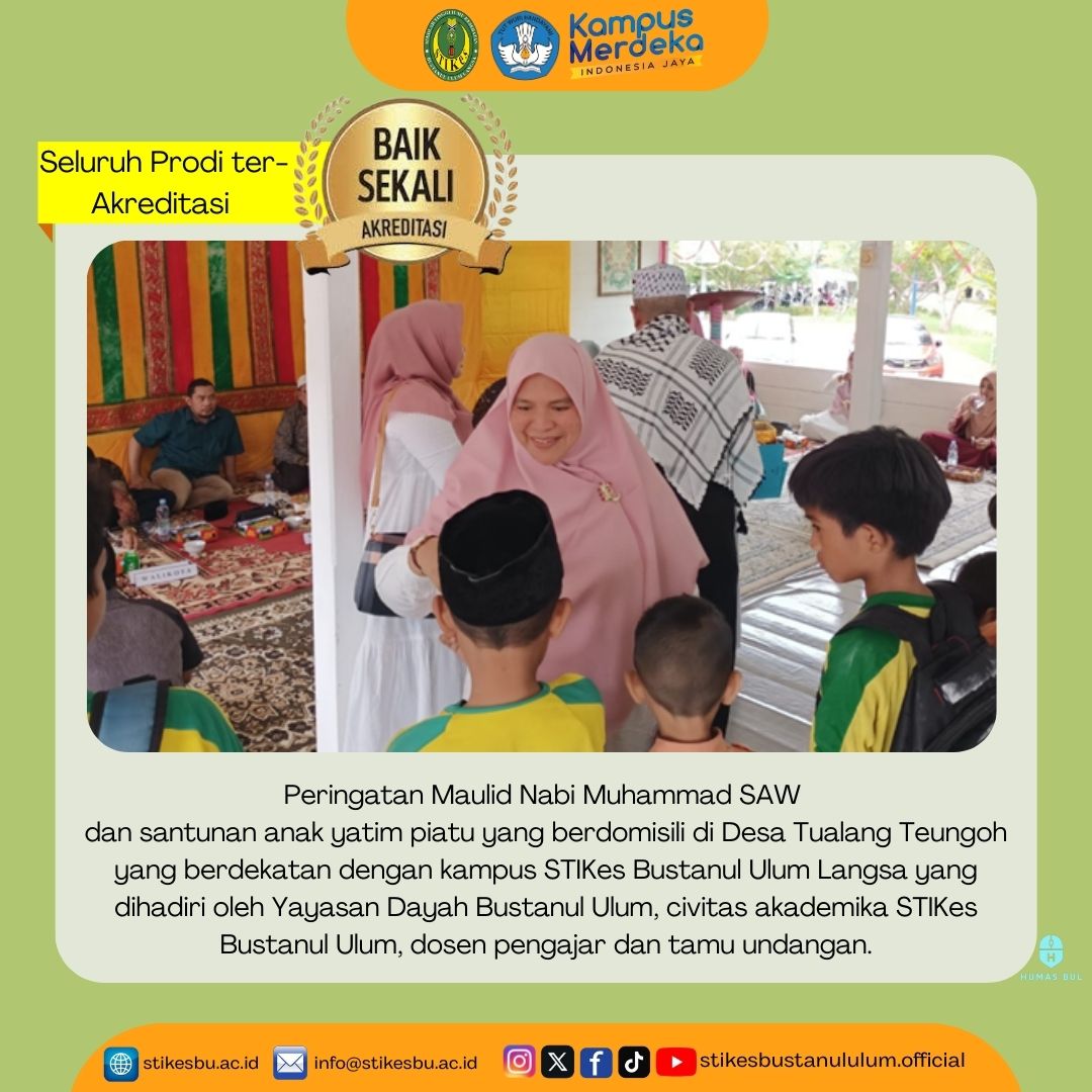 Peringatan Maulid Nabi Muhammad SAW dan santunan anak yatim piatu yang berdomisili di Desa Tualang Teungoh yang berdekatan dengan kampus STIKes Bustanul Ulum Langsa yang dihadiri oleh Yayasan Dayah Bustanul Ulum, civitas akademika STIKes Bustanul Ulum, dosen pengajar dan tamu undangan. Berlokasi di mushalla STIKes Bustanul Ulum Langsa.