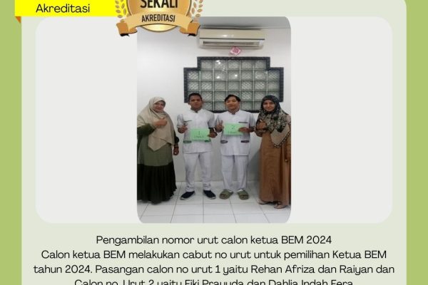 Rabu, 27 Desember 2023 Calon ketua BEM melakukan cabut no urut untuk pemilihan Ketua BEM tahun 2024. Pasangan calon no urut 1 yaitu Rehan Afriza dan Raiyan dan Calon no. Urut 2 yaitu Fiki Prayuda dan Dahlia Indah Fera