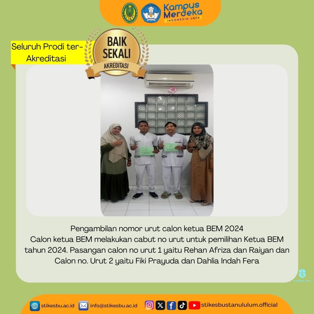 Calon ketua BEM melakukan cabut no urut untuk pemilihan Ketua BEM tahun 2024. Pasangan calon no urut 1 yaitu Rehan Afriza dan Raiyan dan Calon no. Urut 2 yaitu Fiki Prayuda dan Dahlia Indah Fera