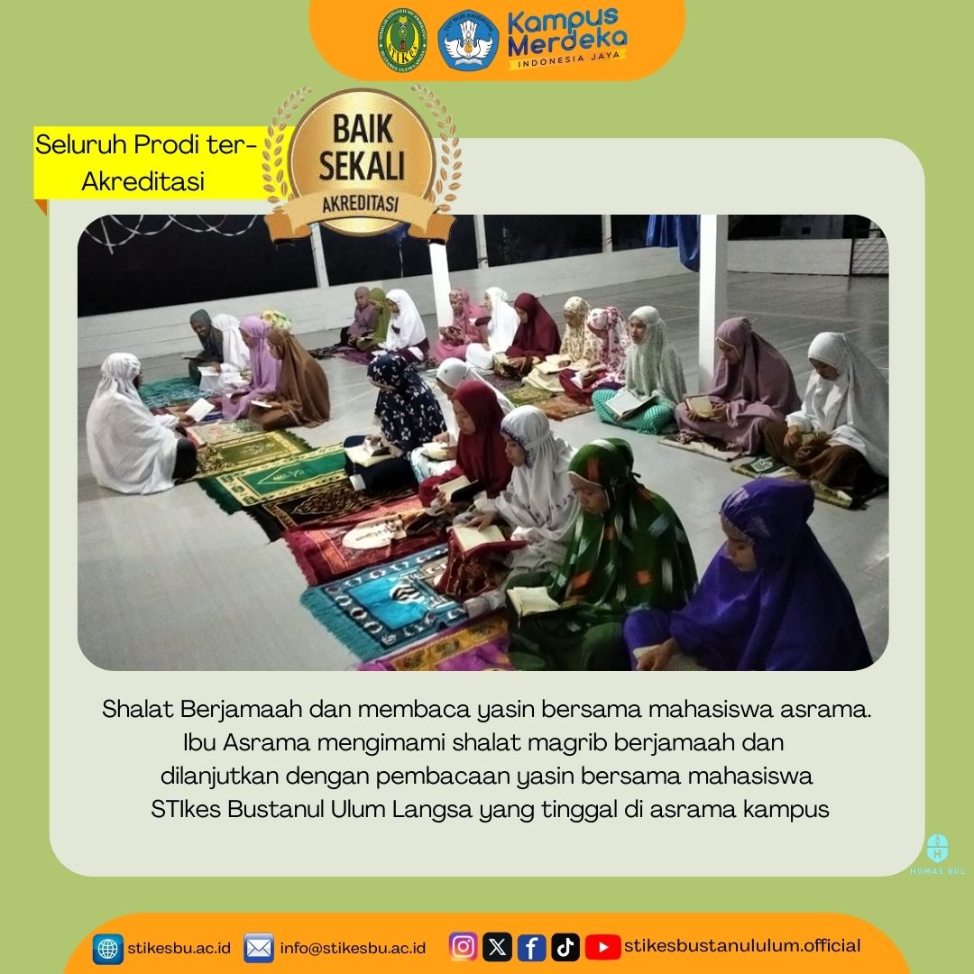 Kepala srama mengimami shalat magrib berjamaah dan dilanjutkan dengan pembacaan yasin bersama mahasiswa STIkes Bustanul Ulum Langsa yang tinggal di asrama kampus.