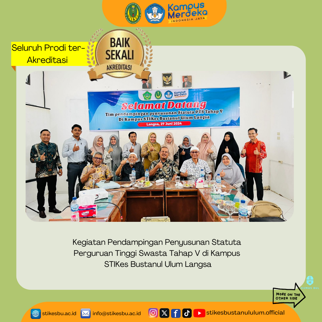 Melakukan review dokumen statuta Sekolah Tinggi Ilmu Kesehatan Bustanul Ulum Langsa yang sudah diunggah pada Pangkalan Data Pendidikan Tinggi. Memaparkan hasil review dokumen statuta Sekolah Tinggi Ilmu Kesehatan Bustanul Ulum Langsa yang sudah diunggah pada Pangkalan Data Pendidikan Tinggi, dan Melakukan pendampingan dan diskusi hasil review dokumen statuta Sekolah Tinggi Ilmu Kesehatan Bustanul Ulum Langsa