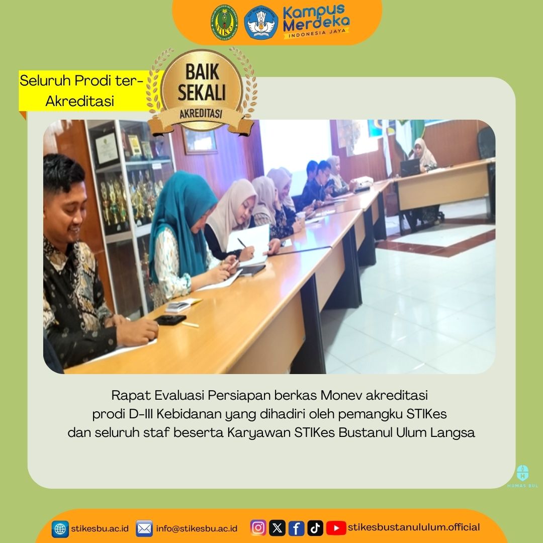 Rapat Evaluasi Persiapan berkas Monev akreditasi prodi D-III Kebidanan yang dihadiri oleh pemangku STIKes dan seluruh staf beserta Karyawan STIKes Bustanul Ulum Langsa