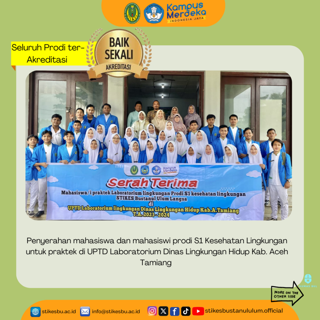 Penyerahan mahasiswa kesehatan lingkungan tingkat 3 untuk praktek di Dinas Lingkungan Hidup kabupaten aceh tamiang, Program Studi S-1 Kesehatan Lingkungan merupakan salah satu pendidikan akademik di STIKes Bustanul Ulum Langsa yang mempunyai visi menghasilkan sarjana kesehatan lingkungan yang mandiri, kreatif, inovatif dan unggul di bidang pengelolaan limbah pada tahun 2025 dan bertujuan mengarahkan mahasiswa menjadi lulusan yang menguasai kemampuan dalam bidang kerja khususnya di bidang Kesehatan Lingkungan dan mempunyai keunggulan di bidang pengelolaan limbah.