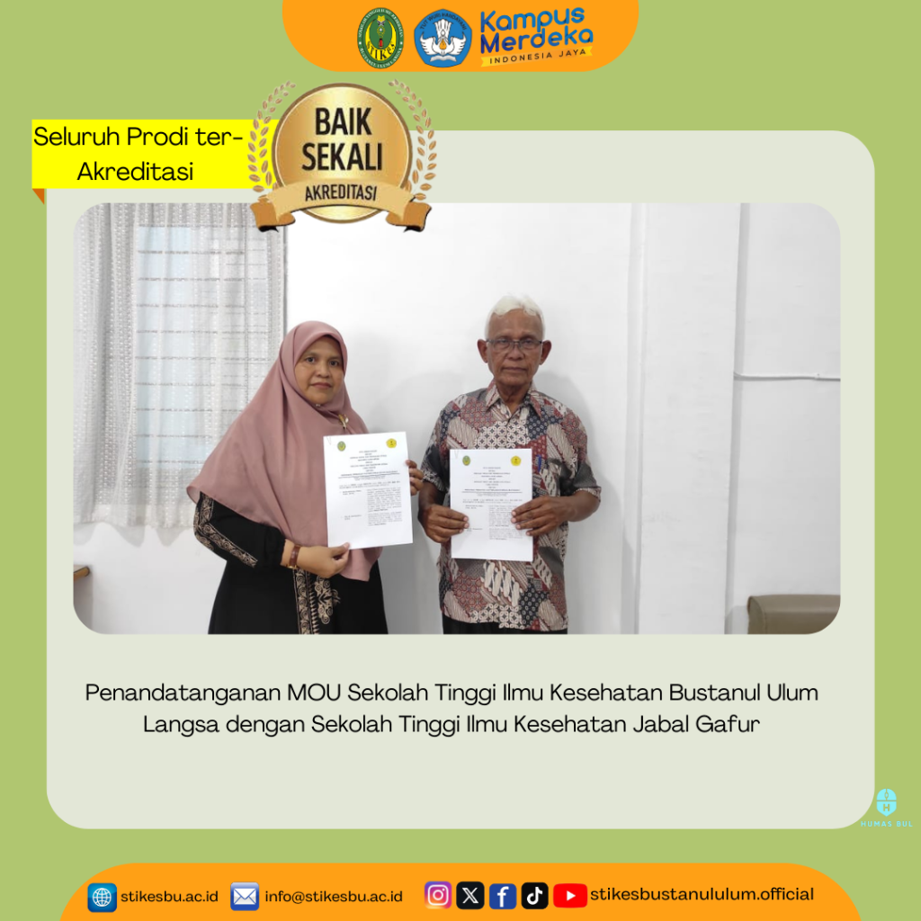 Banda Aceh – Senin, 1 juli 2024 Ketua STIKes Bustanul Ulum Langsa Bd.Nurhidayati,S.Sos.,S.Keb.,M.Ph dan Ketua STIKes Jabal Ghafur Drs.H.Syamsuddin,M.Kes menandatangani MOU tentang pendidikan, penelitian, dan pengabdian kepada masyarakat dalam rangka mengoptimalkan prinsip kemitraan yang saling memberi manfaat.