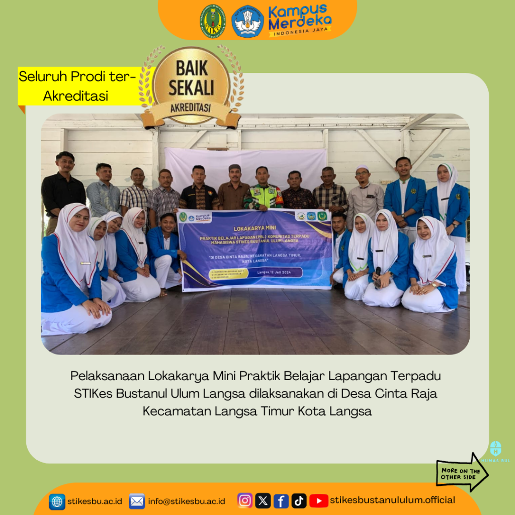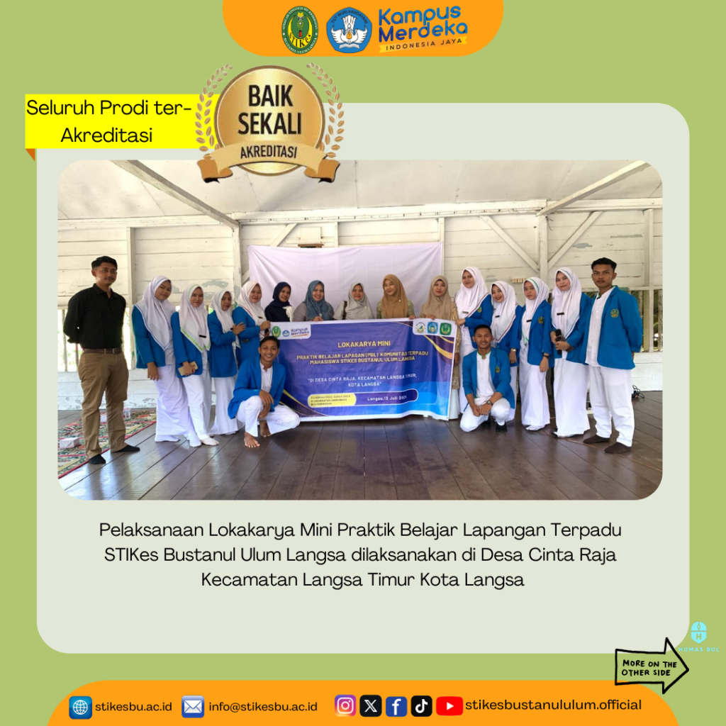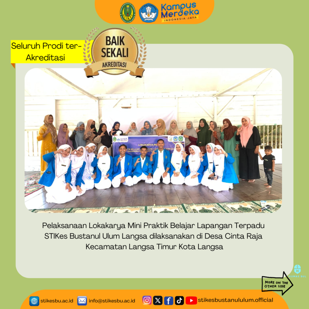 Langsa – Senin 15 juli 2024, dalam rangka pelaksanaan Praktek Belajar Lapangan (PBL) Komunitas Terpadu pada mahasiswa/i STIKes Bustanul Ulum Lagsa yang terdiri dari 3 program studi yaitu prodi S-1 Administrasi Rumah Sakit, S-1 Kesehatan Lingkungan dan D-III Kebidanan dengan melakukan musyawarah masyarakat Desa dalam kegiatan Lokakarya Mini (Lokmin) yang dilakukan oleh Mahasiswa/i STIKes Bustanul Ulum Langsa di Desa Cinta Raja Kecamatan Langsa Timur Kota Langsa pada hari senin, 15 Juli 2024 dibawah bimbingan ibu Ayunin Syahida, SST., M.K.M, Nadia Isnaini, S.Kes., M.K.M dan Bapak Aulia Zikra, S.Kes. Kegiatan Lokakarya Mini ini dilakukan mulai dari pukul 08.00 WIB s.d Selesai.