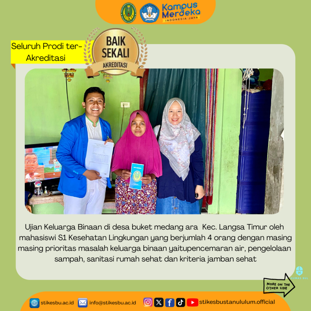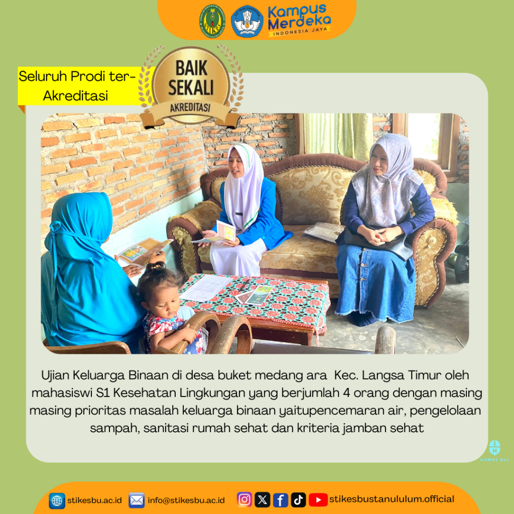 Langsa – Selasa, 23 juli 2024 telah dilaksanakan kegiatan ujian keluarga binaan di desa buket medang ara kecamatan langsa timur oleh mahasiswa prodi S1 kesehatan lingkungan yang berjumlah 4 orang. Dalam kegiatan ini masing masing mahasiwa menyampaikan prioritas masalah keluarga binaan seperti pencemaran air, pengelolaan sampah, sanitasi rumah sehat dan kriteria jamban sehat, di bawah bimbingan ibu Etika Sari, S.K.M., M.K.M.