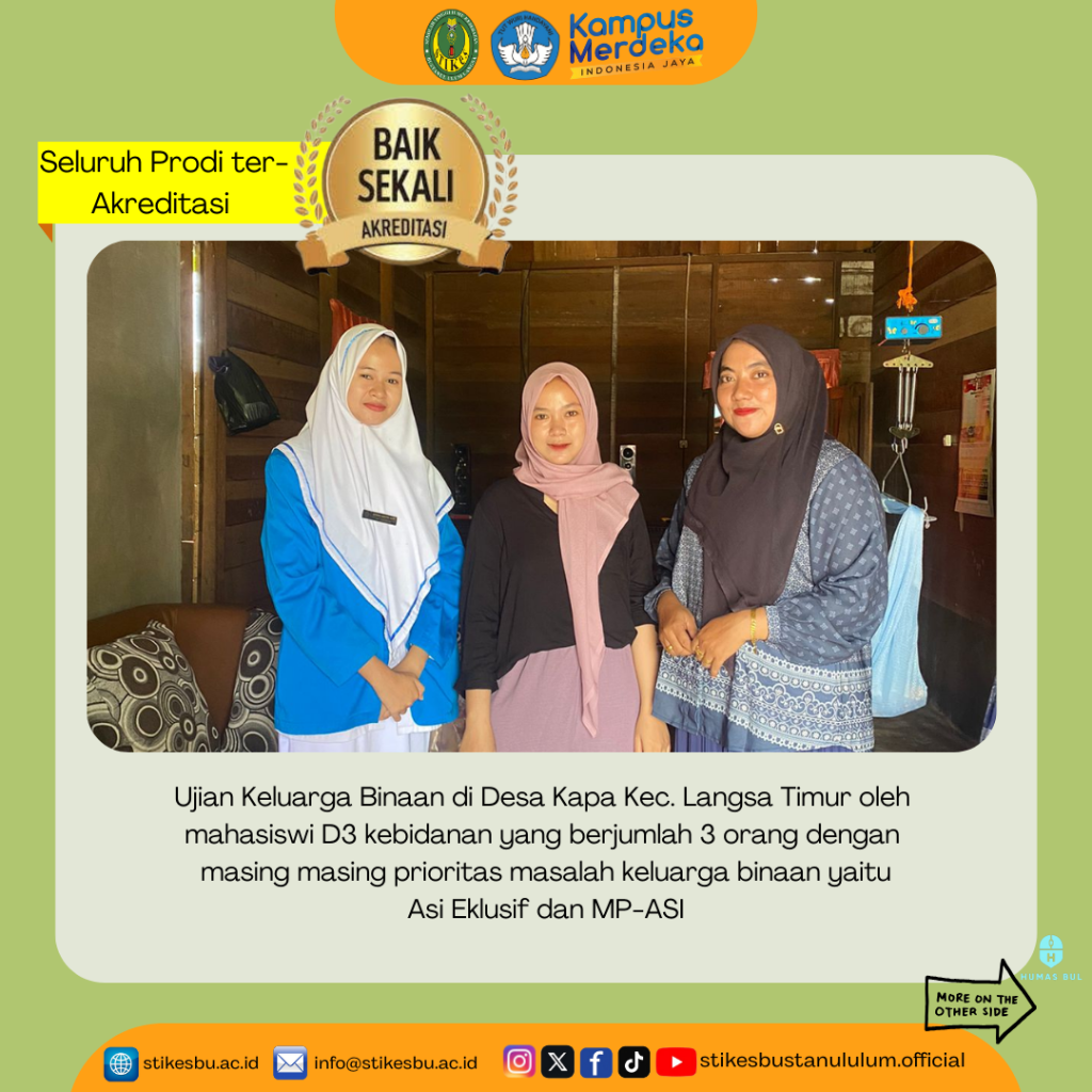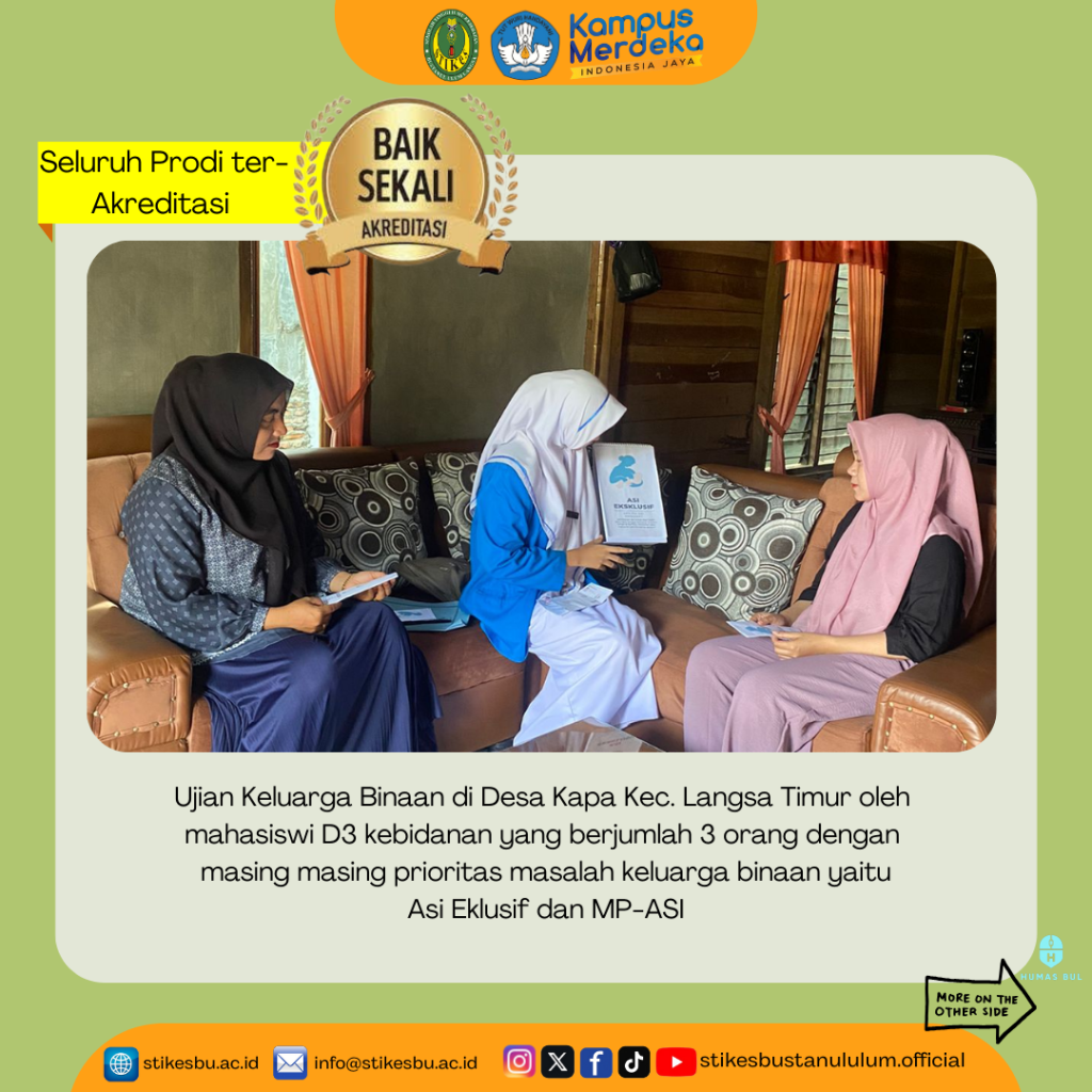 Langsa, Selasa, 23 Juli 2014 pelaksanaan keluarga binaan (Kelbin) di Desa Kapa kec Langsa Timur Kota Langsa oleh Prodi D-III Kebidanan STIKes Bustanul Ulum Langsa dengan perioritas masalah Asi Eklusif dan MP-ASI dengan jumlah mahasiswi 3 orang di bawah bimbingan Dari Dosen STIKes Bustanul Ulum Langsa.adapun desa di pimpin oleh geuchik Pj.Mad Yani.,SH.