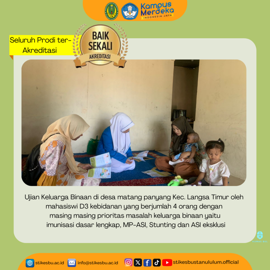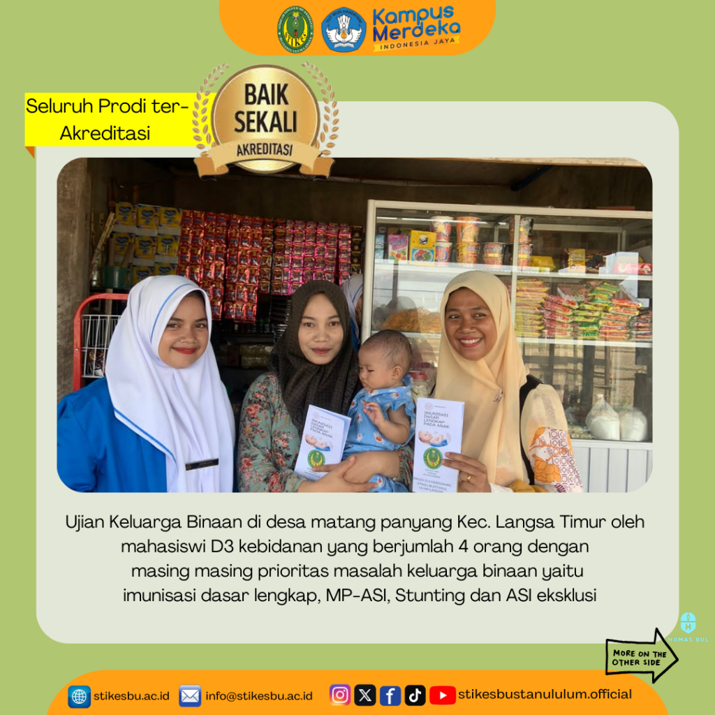 Oleh STIKES Bustanul ulum langsa program studi D3 kebidanan yang berjumlah 4 org dengan masing2 prioritas masalah keluarga binaan ( imunisasi dasar lengkap, MP-ASI, Stunting dan ASI eksklusif ) di bawah bimbingan ibu Maya Sari, SST, M.K.M
