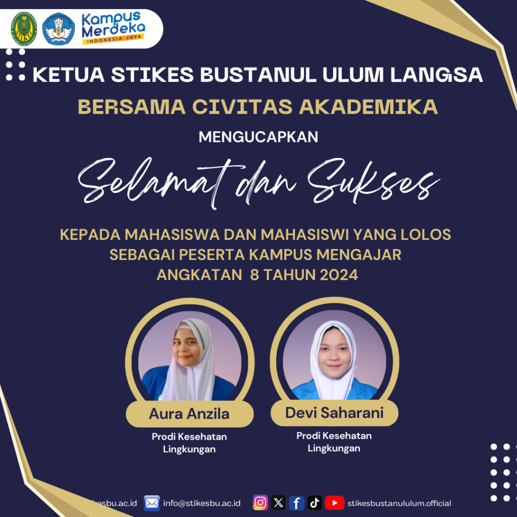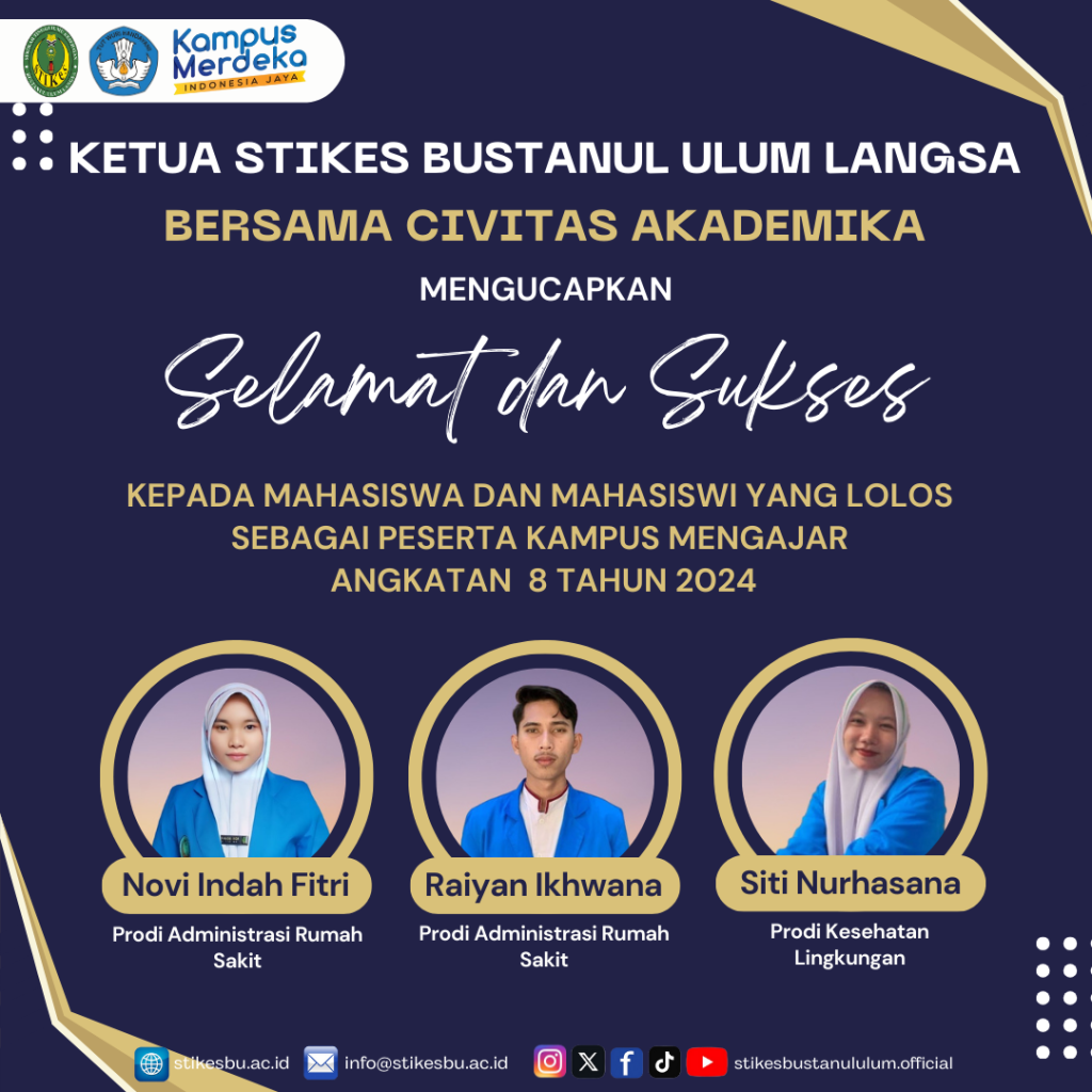 Selamat dan Sukses ! 5 mahasiswa STIKes Bustanul Ulum Langsa Lolos Program Kampus Mengajar. Kampus Mengajar adalah merupakan bagian dari kebijakan Merdeka Belajar Kampus Merdeka (MBKM) yang diselenggarakan secara nasional oleh Kemendikbudristek.