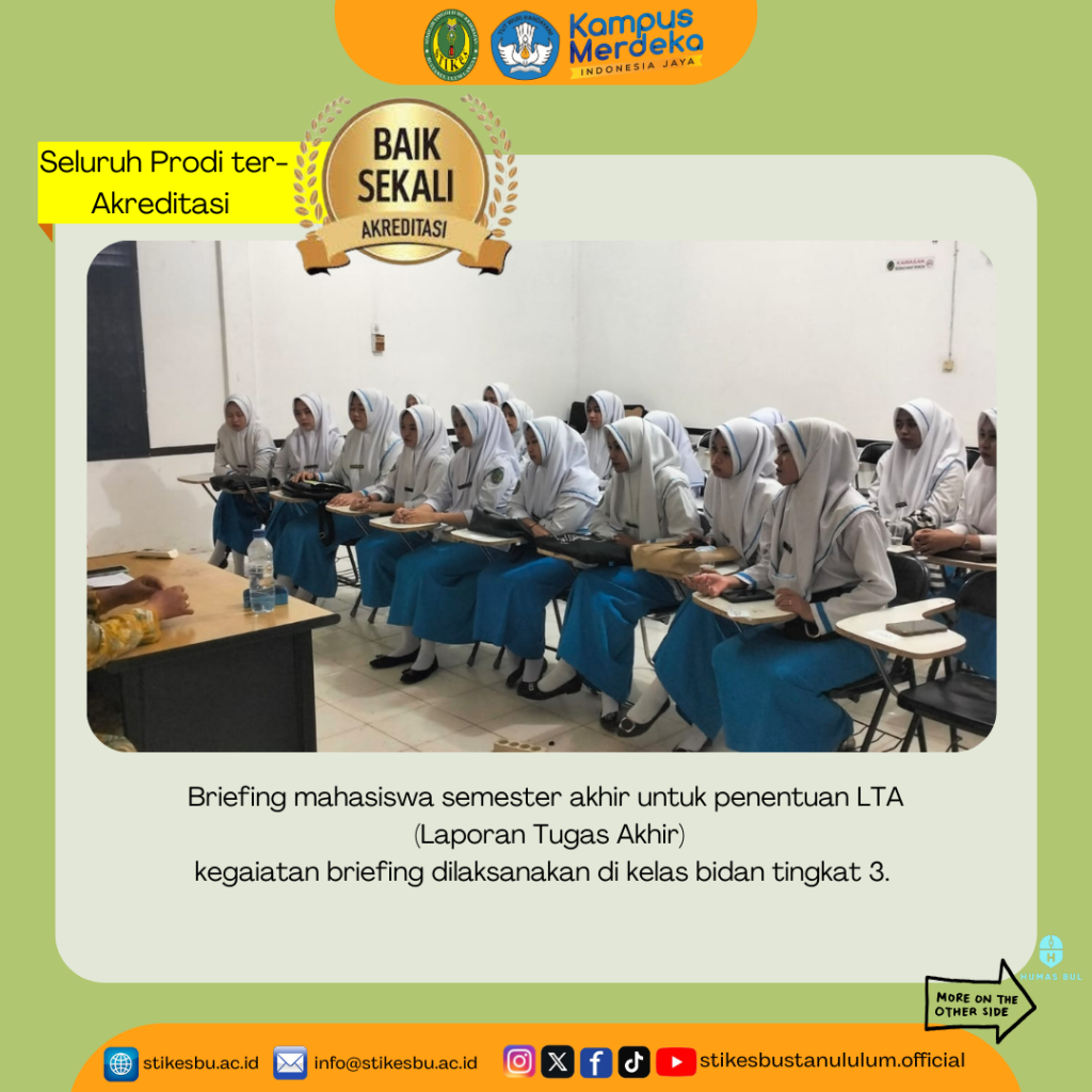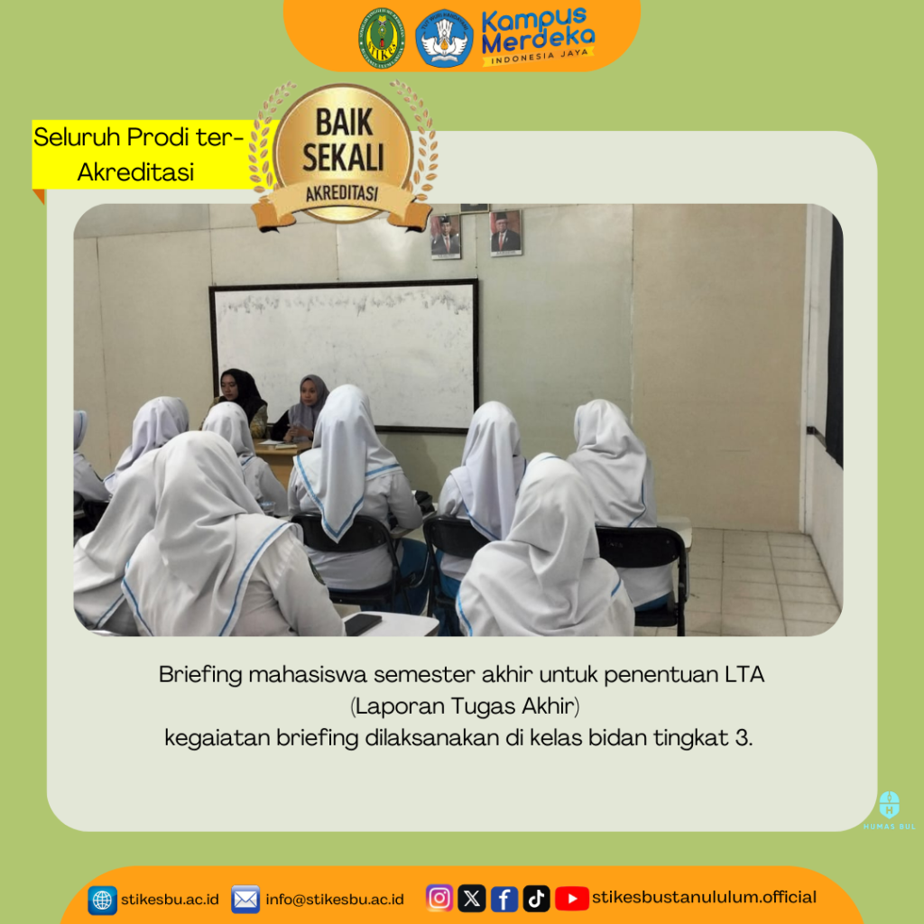 Langsa – Kamis 8 Agustus 2024, Briefing mahasiswa SM.akhir untuk penentuan LTA. adapun kegaiatan briefing dilaksanakan di kelas bidan tingkat 3. briefing dilaksanakan oleh kaprodi D-III Kebidanan STIKes Bustanul Ulum Langsa ibu Ayunin Syahida.,SST.,MKM bersama Staf prodi Nurfadillah.,S.Tr.Keb adapun jumlah mahasiswi yang hadir dalam briefing adalah 20 org.dalam hal ini kaprodi menyampaikan: mencari ibu hamil TM 3 untk penyususan LTA (Laporan Tugas Akhir) dengan usia kehamilan 7 bulan yang di mulai di bulan september 2024 dan persalinan di bulan november akhir dan Desember awal 2024, pastikan bumil tidak dengan patologis, dan persalinan di tempat bidan, dan mencari bumil di wilayah kota langsa baik di BPM dan Polindes sekitaran Kota Langsa, Lakukan Kunjungan Kehamilan 1x dengan pembimbing datang dan INC.PNC serta BBL.